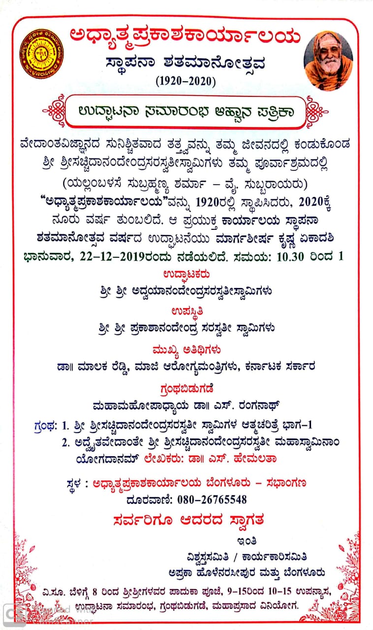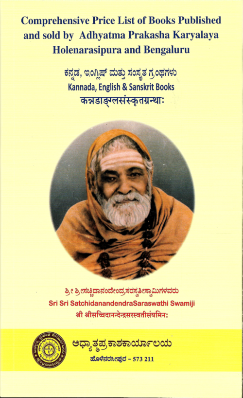 Adhyatmaprakasha Karyalaya was founded in 1920 by Sri Yellambalase Subbarao (1880-1975), a school teacher in Karnataka; (he also used the name Yellambalase Subrahmanya Sharma in some of the books he authored to distinguish himself from Sri Yedatore Subbarao, another author of many books on spirituality). After his retirement he moved to Holenarasipura in 1937 and established the Karyalaya on its own premises there. Sri Subbarao took to Sanyasa in 1948 with the monastic name Sri Sri Satchidanandendra Saraswati.
