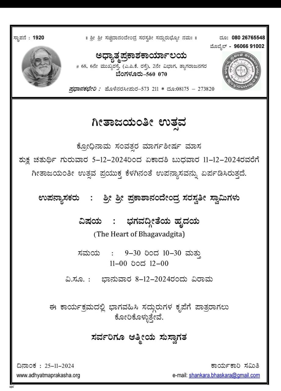 The Karyalaya has four branches in addition, at Bangalore, Mysore, Mattur (Shimoga) and Rayadurga (A.P.).